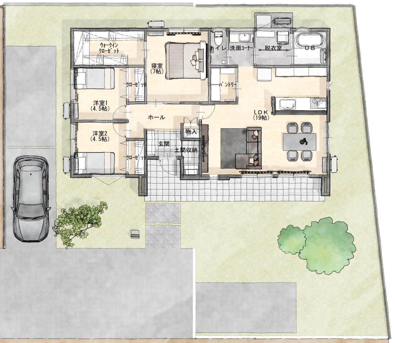 玄関を中心に、19帖のLDKや個室をバランスよく配置した暮らしやすい平屋プランです。