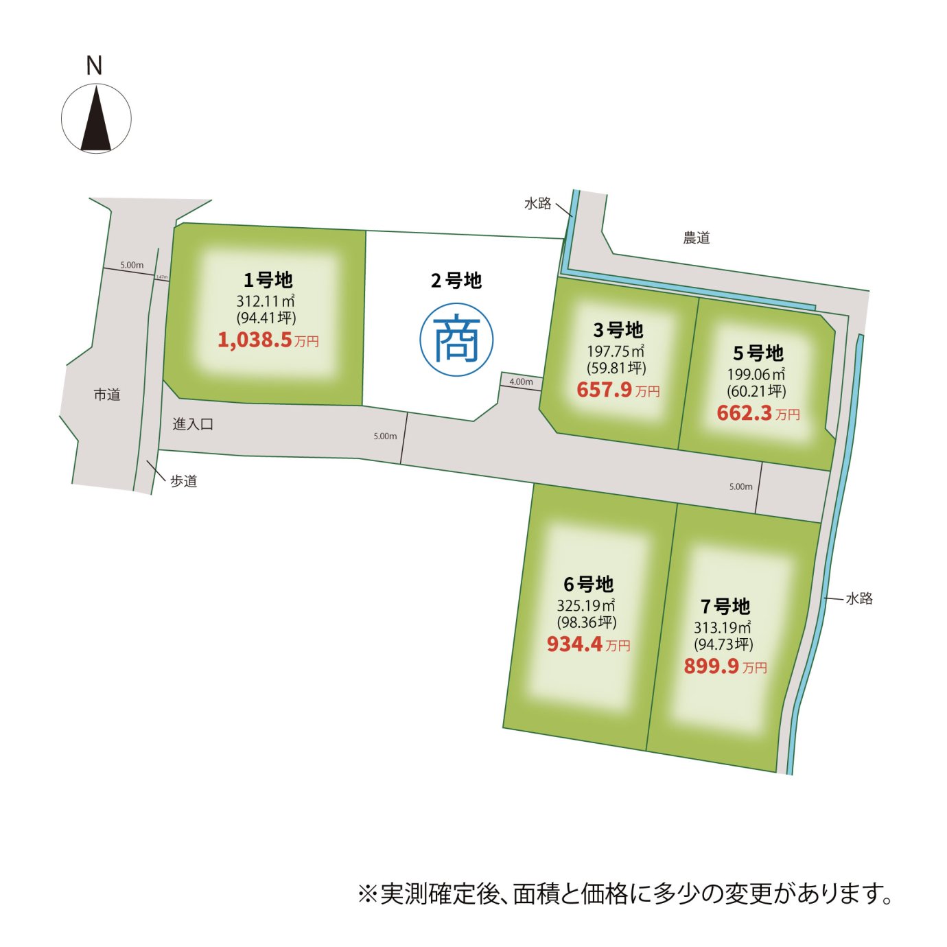 | 道路 | 進入口 :西側(市道)歩道含む 約 6.47m 分譲地内:(開発道路)約 4~5m ※寄附予定 |