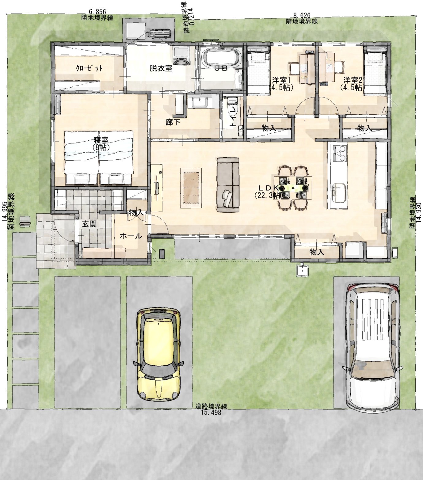 独立した洗面スペースや随所に設けた収納など、暮らしやすさにもこだわった間取りです。