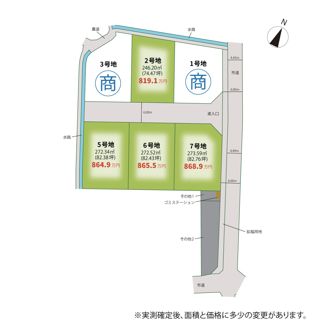 | 道路 | 進入口 :東側(市道)約 6.00m 分譲地内:(開発道路)約 6.00m ※寄附予定 |