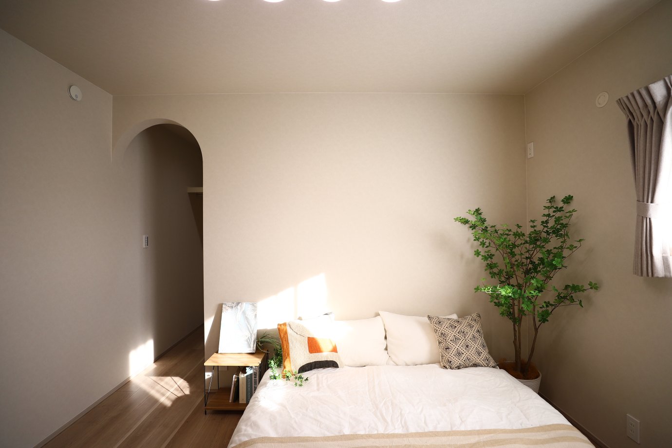 ウォークインクローゼットのアーチ壁が空間に柔らかさを添え、癒しのひとときを演出。