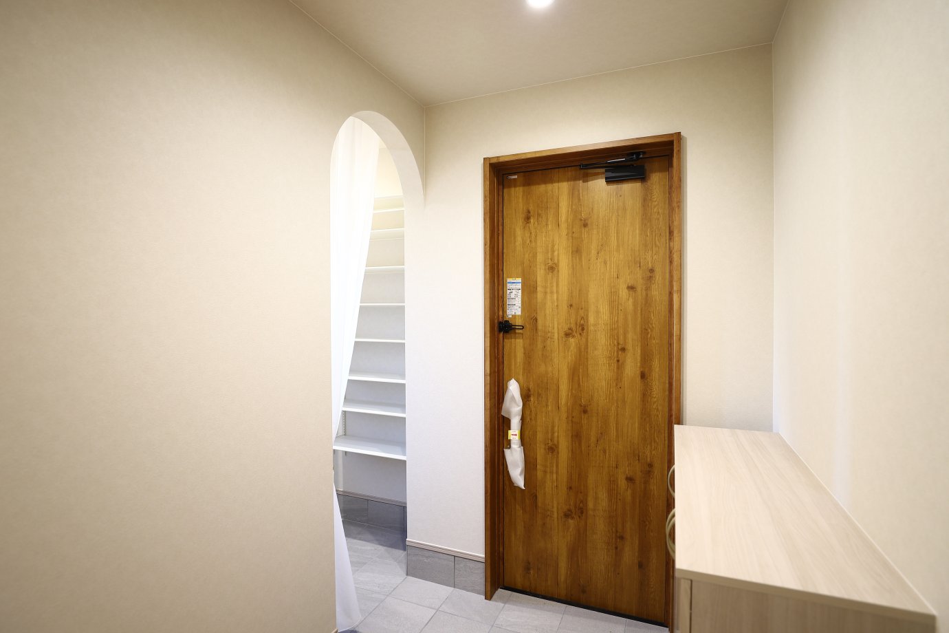 木目の玄関ドアが温かく出迎える、シンプルで上品な玄関スペース。
