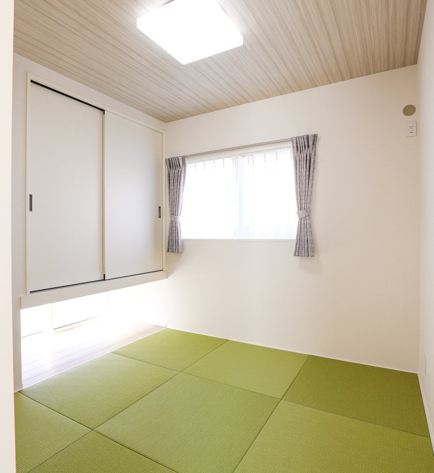 和室ながら、洋のエッセンスが漂うデザインが魅力的です。マスカット色の畳が空間に明るさを加え、和と洋が見事に調和した雰囲気を演出。さらに、収納スペースもしっかりと確保されており、使い勝手も抜群。和の趣を感じつつ、現代的な快適さも兼ね備えた空間です。 -