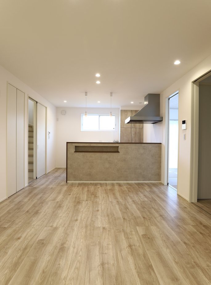背面収納付きのキッチンは、使い勝手が良く見た目もすっきり。センスの良いデザイン扉がアクセントになったLDKは、広々として明るく、開放感のある快適な空間に仕上がっています。