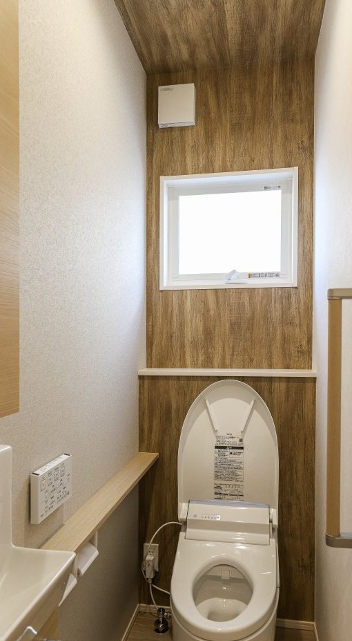 白と木目調を組み合わせたトイレは、清潔感とあたたかみが感じられる落ち着いたデザイン。ビデ機能付きのリモコンや手洗い器も完備しており、快適性と機能性を兼ね備えた空間に仕上がっています。 -