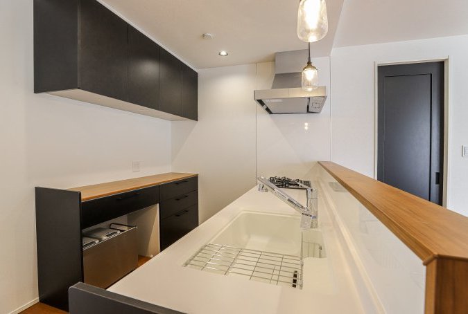 LDKは濃いめの木目フローリングに、白を基調とした内装が映える上品な空間。キッチンには背面収納が備わっており、たっぷりの収納力で見た目もスッキリ。暮らしやすさとデザイン性を兼ね備えた空間です。